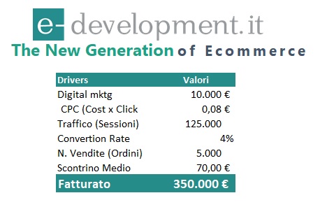 I modelli più realistici verificati di persona su progetti ecommerce di successo partono dal Budget periodico (mensile o annuale) in Digital Marketing per arrivare al numero di ordini e al fatturato.