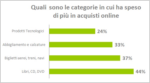 - SETTORI TOP: Libri, cd e dvd, viaggi/trasporti, abbigliamento sono i prodotti e servizi in cui gli utenti dichiarano di aver speso di più. Anche l’abbigliamento, un settore in cui fino a qualche tempo fa sembrava lontano dalle vendite online raccoglie un 33% di intervistati.
