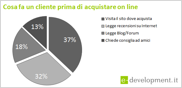 - PRE-ACQUISTO: Sono informazione e consapevolezza le parole chiave dell’acquirente online. Prima di comprare ci si informa, soprattutto sul sito ufficiale di vendita (69%) o attraverso le recensioni presenti in rete (59%). Una parte importante (34%) dei clienti legge Forum o blog.