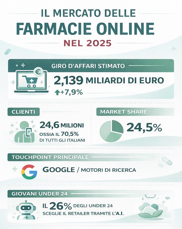 Nel 2025 il mercato delle farmacie online rappresenta uno dei segmenti più solidi e strutturati dell’eCommerce italiano. Il giro d’affari raggiunge 2,139 miliardi di euro, con una crescita annua del +7,9%, confermando come il canale digitale non sia più un’alternativa, ma una componente stabile del sistema distributivo farmaceutico.